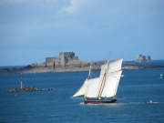 La bisquine devant les forts du Petit Bé et de La Conchée