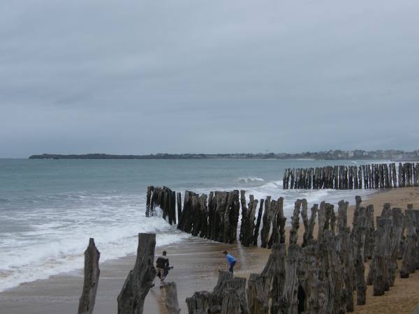 | Les brise lames Ces troncs de chênes enfoncés profondément dans la grève sont des brise-lames. Quand ils sont disposés soit paralléllement à la digue, ils ont pour but de briser les vagues avant leur choc contre la digue et ainsi de la protéger. Quand ils sont disposés en épi par rapport à la digue, ils ont pour but de réguler les mouvements de sable sous l'action des marées et tempêtes |