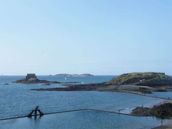 | Les iles De nombreuses iles, ilots ou rochers parsèment la baie de St Malo Le Grand Bé est accessible à marée basse Le tombeau de Chateaubriant s'y trouve, face au large Juste dérrière , le Petit Béest lui aussi accessible aussi à marée basse ( pendant un temps plus restreint) Un peu plus au large se trouve l'ile de Cézembre, avec..... la seule plage orientée au Sud du secteur. Aussi incroyable que cela puisse paraître, les malouins ont autrefois fait paître leurs bêtes sur les prés de Cézembre (au 12ème siècle). Plus récemment, pendant la seconde guerre mondiale, l'ile a subi des bombardements alliés importants ( elle a eu la primeur locale des bombes au Napalm) Et puis il y a aussi La Conchée, Le fort National, Fort Harbour... Faut-il préciser que pour assurer la défense de St Malo contre les anglais, ces iles ont été fortifiées par Vauban |